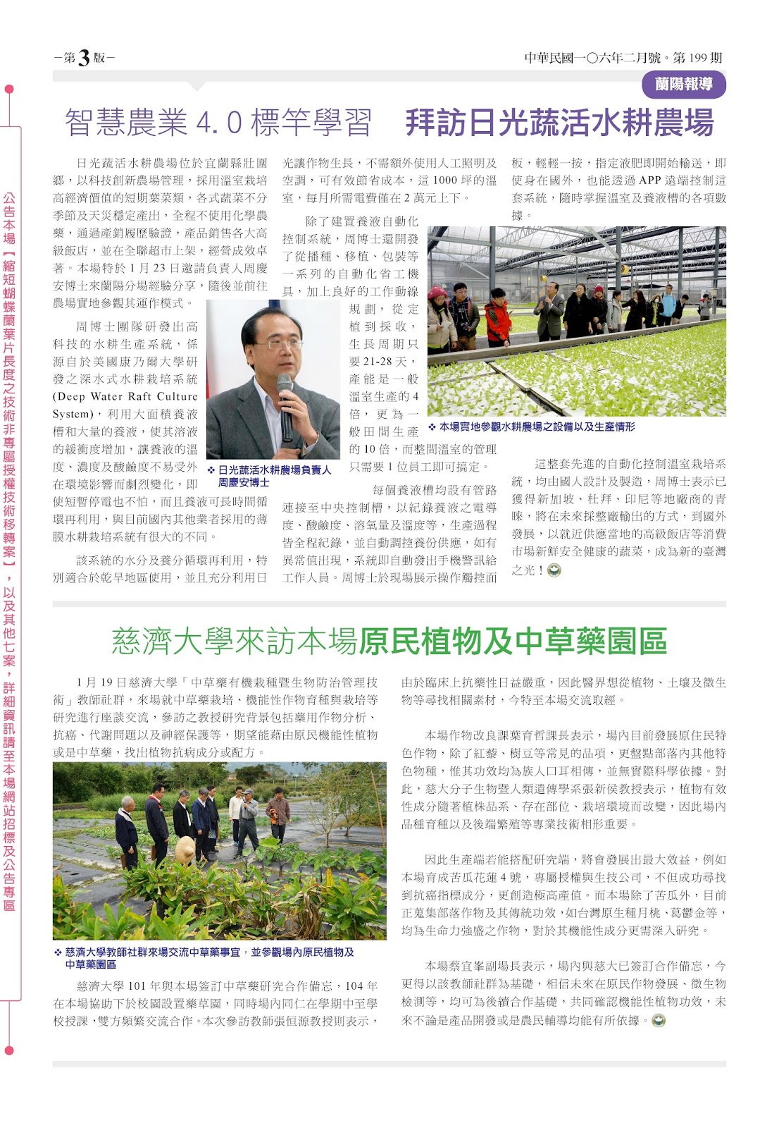 日光蔬活水耕農場位於宜蘭縣壯圍鄉,以科技創新農場管理,採用溫室栽培高經濟價值的短期葉菜類,各式蔬菜不分季節及天災穩定產出,全程不使用化學農藥,通過產銷履歷驗證,產品銷售各大高級飯店,並在全聯超市上架,經營成效卓著。本場特於1月23日邀請負責人周慶安博士來蘭陽分場經驗分享,隨後並前往農場實地參觀其運作模式。