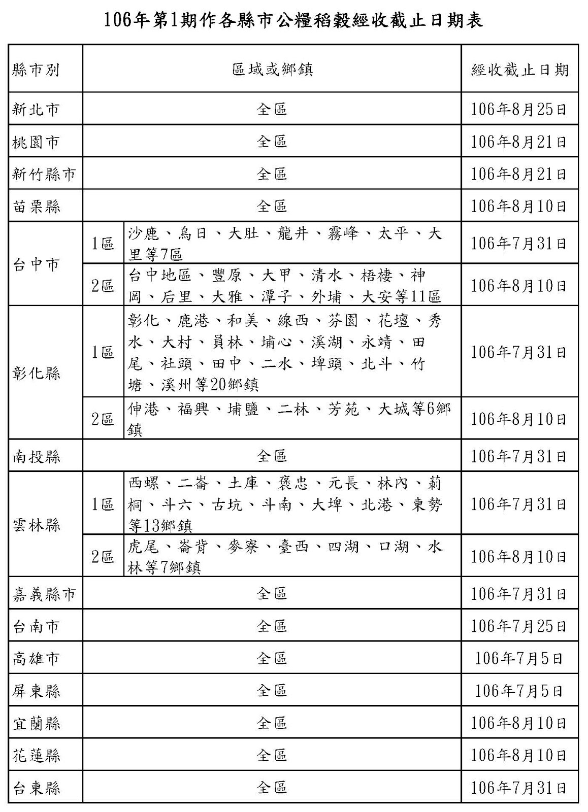五、本期收購期限:各地區稻穀收穫後即開始辦理收購,收購截止日期如下: